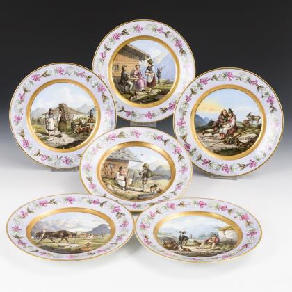 Im Spiegel feine farbige Bemalung. Seegrün und gold staffiert. Ansicht nach einer Vorlage von Carl Friedrich Wilhelm Klose (1805-1875). Rückseitig Metall-Öse. Schwarzer Titel, Pressmarke, rote Reichsapfelmarke, Malermarke N, blaue Zeptermarke mit Beizeichen