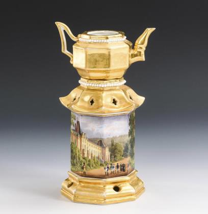 3-teilig. Oktogonale Form. Kännchen mit Goldfond und Perlband. In Form einer Pagode gestaltetes Stövchen mit bezeichneten Ansichten (Schloss Malmaison, Haverton)