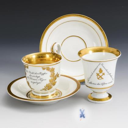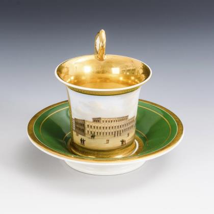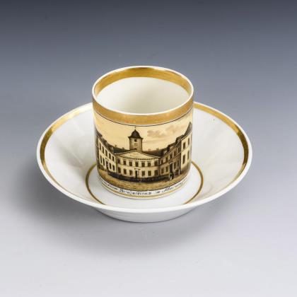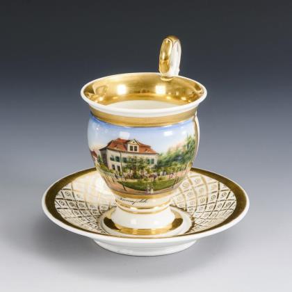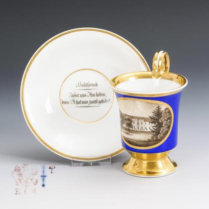Gefußte Kratertasse mit Perlbandhenkel. Schauseitig ein Medaillon mit der sepiagemalten Ansicht eines Schlosses in einem Park, im Spiegel der Untertasse die Aufschrift "Wahlspruch / Lasset uns Ihn lieben, denn Er hat uns zuerst geliebt."