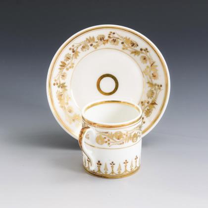 Zylindertasse mit Ohrenhenkel. Goldbemalt mit einem Blütenband am Rand und Ornamentzier am Stand