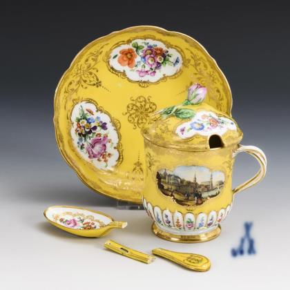 Gefußte Tasse mit gewundenem Henkel und Knaufdeckel. Schauseitig auf der Tasse eine Vierpasskartusche mit der Ansicht von Dresden mit Blick auf Semperoper, Hofkirche und Belvedere, in den übrigen Kartuschen polychrome Blumenmalerei, reiche, ornamentale Goldmalerei. Als Zugabe defekter Löffel