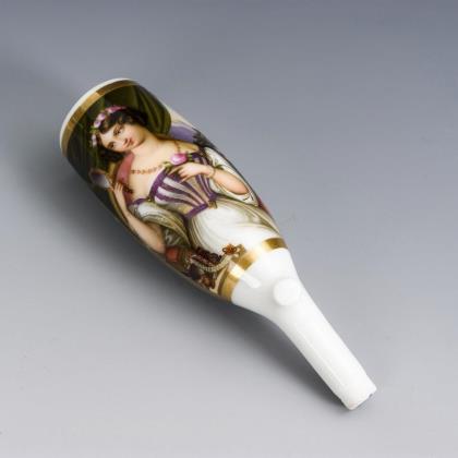 Kratertasse mit Maskaronhenkel. Schauseitig die Darstellung der Ariadne mit Spinnrocken. Malerei wohl von Georg Joseph Haemmerl (* 1793)