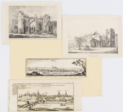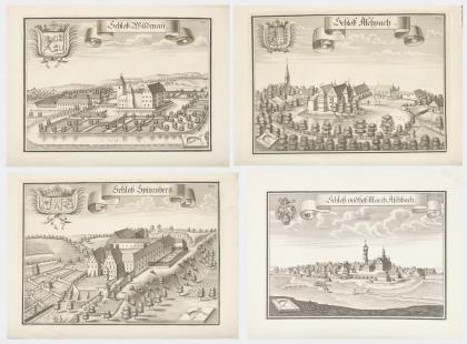 "Schloß Wildenau", Platte: 26 x 36 cm, Blatt: 30,5 x 42 cm | "Schloß Aschpach", Platte: 26,5 x 36 cm, Blatt: 30 x 41,5 cm | "Schloß Spitzenberg", Platte: 26,5 x 36,3 cm, Blatt: 30 x 41 cm | "Schloß und Hof=Marsch Aschbach", Platte: 26,5 x 36,3 cm, Blatt: 34,5 x 43 cm; aus: "Historico Topographica Descriptio", 1701 - 1726