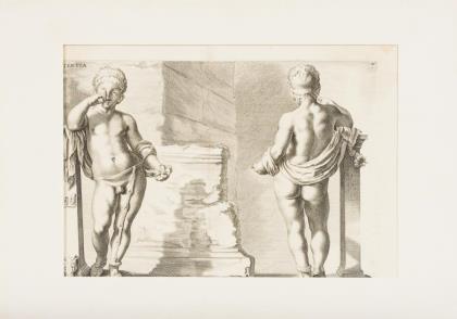 3 Tafeln mit antiken Skulpturen aus Joachim von Sandrarts "Teutsche Akademie", 1680 - "Meleager", Blatt: 41 x 24,5 cm, im Passepartout: 43 x 30,5 cm, "Poenitentia", 27,5 x 36,7 cm, im Passepartout: 30,5 x 43 cm und "Castor, Cybele, Fedra, Agrippina", Blatt: 41 x 25 cm, im Passepartout: 43 x 30,5 cm, je griffspurig, je verso mit Kleberückständen | 3 Tafeln aus Bernard Picards "Veux des ancient Romains", 1780, Blatt je: 42 x 25,5 cm, im Passepartout je: 43 x 30,5 cm, 1x stockfleckig | Tafel mit Darstellung mit Sandalen bekleideter Füße antiker römischer Statuen, wohl Johann Franck, Blatt: 41,3 x 24,3 cm, im Passepartout 43 x 30,5 cm, griffspurig