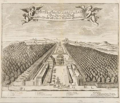 Vogelperspektivische Darstellung der barocken Schlossanlage Friedrichsthal in Gotha, bezeichnet "Fürstl. Sachs. LustPallais FriedrichsThal nebst den Brotte und andern kostbaren Gebeuden", mit Legende; aus Friedrich Rudolphis "Gotha diplomatica oder ausführliche historische Beschreibung des Fürstenthums Sachsen-Gotha", 1717