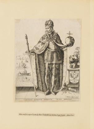 Ganzfiguriges Bildnis des Kaisers Karl V. von Habsburg (1500 - 1558) in Harnisch und Königsmantel, mit Reichskrone, Reichsschwert und Reichsapfel; aus einer Folge berühmter Persönlichkeiten um 1600