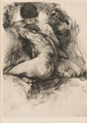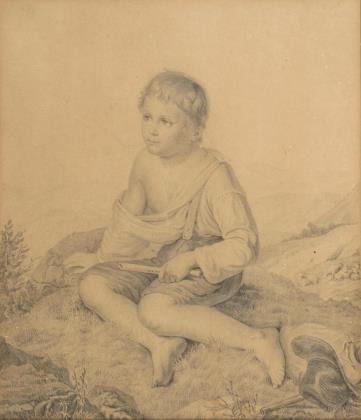 Damenporträt, Blatt: 33,8 x 30 cm, Randbereich knickspurig, oberer rechte Ecke fehlt | Sich anschauendes Paar, Blatt: 17 x 22,5 cm, auf Karton montiert: 25 x 32,5 cm, Blatt griffspurig | Skizze eines Esels, Blatt: 17 x 22,5 cm, Blatt griffspurig und fleckig, verso orientalische Stadtansicht | Junge Dame auf einem Felsen sitzend, Blatt: 22 x 16,8 cm, auf Karton montiert: 32,3 x 25 cm, stockfleckig, Ecke oben rechts knickspurig | Hockende Frau, Blatt: 19,5 x 15 cm, auf Karton montiert: 32,5 x 25 cm, stockfleckig, rechter Rand mit Wasserfleck