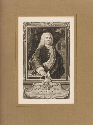 Porträt des Dichters und Hamburger Senators Barthold Heinrich Brockes (1680 - 1747), bezeichnet "Barthold Heinricus Brockes, Lt . | Comes Palatinus Cæsareus et Reipubl. Hamburgensis Senator. Denner pinxit. J. Jac. Heid exc. A. V. | Dec. II.“; aus der Publikation "Jacob Brucker: Bilder-sal heutiges Tages lebender, und durch Gelahrtheit berühmter Schrifft-Steller… – Zweytes Zehend. – Augspurg : Jo. Jacob Haid, 1742", nach einem Gemälde von Balthasar Denner (1685 - 1749)