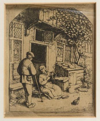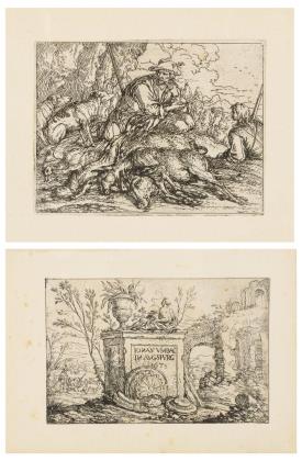 Monument vor einer Landschaft mit Ruinen, mit Hirten und Herde im Hintergrund, Platte: 10,3 x 15,6 cm, beschnitten und etwas stockfleckig, in der Platte datiert 1678 | Zwei Jäger mit erlegtem Wild, Platte: 7,8 x 10 cm, beschnitten und etwas stockfleckig, aus Nagler 169 und 143