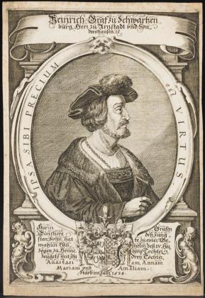 Dekoratives Porträt im Profil von "Heinrich Graf zu Schwarzenburg, Herr zu Arnstadt und Sondershausen" (1499 - 1538), in ovalem Rahmen, bezeichnet "Ipsa Sibi Precium est Virtus", mit dem Großen Wappen des Adelsgeschlechtes Schwarzburg