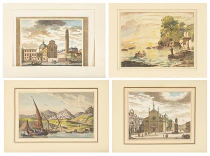 Ansicht der Basilika Santi Giovanni e Paolo in Rom, Platte: 28 x 35,6 cm, Blatt: 32 x 45 cm, Bugfalte, stockfleckig | Ansicht der Kirche San Giorgio dei Greci in Venedig, Platte: 28 x 35,6 cm, Blatt: 32 x 45 cm, Bugfalte, stockfleckig | J.B. Tillard: "Vue de la Ville et de l'Ile de Syra" - Ansicht der griechischen Insel Syros, Platte: 25 x 37 cm, Blatt: 29,5 x 42,5 cm, stockfleckig | Heroische Landschaft nach einem Gemälde von Claude Lorrain, gestochen von Richard Earlom, bezeichnet "From the Original Drawing in the Collection of the Duke of Devonshire No. 165", Platte: 20 x 26 cm, Blatt: 27,3 x 31,5 cm, stockfleckig