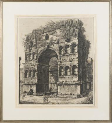 Detailreiche Ansicht des Janusbogens in Rom, bezeichnet "Veduta del Prospetto dell' Arco di Giano"; Nr. 33 aus "Le Antichita Romane"