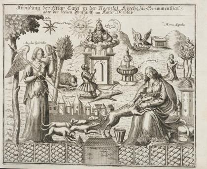 Abbildung des Hortus Conclusus mit zahlreichen Beschriftungen der Altartafel der Hospitalkirche im thüringischen Grimmenthal, die im Jahr 1758 einem Brand zum Opfer fiel, bezeichnet "Abbildung der Altar-Tafel in der Hospital Kirche zu Grimmenthal oder der Neuen Walfarth im Amte Maßfeld"; aus Friedrich Rudolphis "Gotha diplomatica oder ausführliche historische Beschreibung des Fürstenthums Sachsen-Gotha", 1717