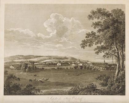 Dekorative Darstellung der thüringischen Stadt Ohrdruf bei Gotha, eingebettet in eine Sommerlandschaft, bezeichnet: "Ansicht der Stadt Ohrdruff mit einer Aussicht auf die Thüringischen Candelaber"