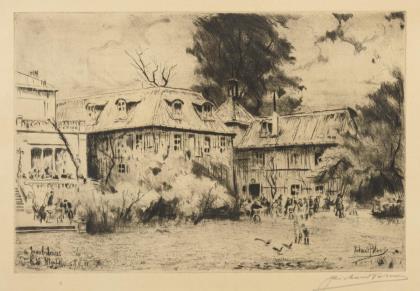 Darstellung des Düsseldorfer Jacobihauses, welches seit 1867 das Gesellschaftshaus des Künstlervereins "Malkasten" ist, dem Richard Bloos angehörte