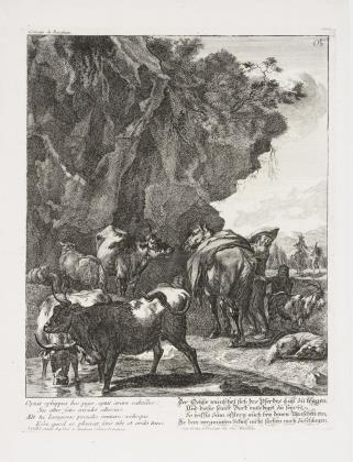 Nach einem Gemälde von Nicolaes Pietersz. Berchem (1620 - 1683), Namenszüge der Künstler in der Platte