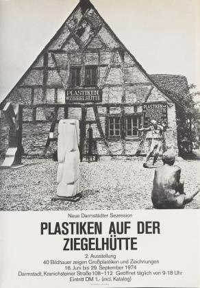 Plakattext: "Neue Darmstädter Sezession - Plastiken auf der Ziegelhütte | 2. Ausstellung | 40 Bildhauer zeigen Großplastiken und Zeichnungen 16. Juni bis 29. September 1974 [...]"