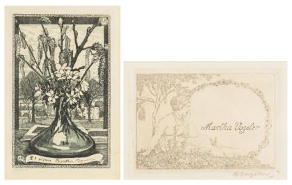 "Martha Vogeler", Radierung, Bleistiftsignatur, Platte: 6,5 x 9 cm, gerahmt & hinter Glas: 21 x 23,4 cm | "Ex Libris Martha Vogeler", Radierung, undeutlich bezeichnet, Platte: 14 x 9 cm, gerahmt & hinter Glas: 30,5 x 25 cm