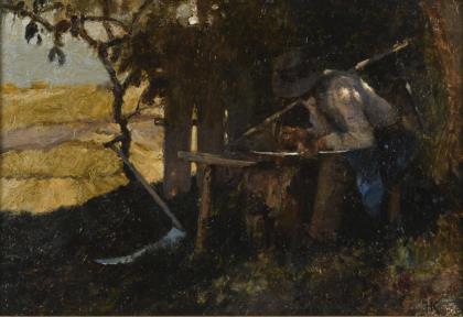 KÖNIG, Hugo (1856 Dresden - 1899 ebd.). Bauer beim Dengeln der Sense.