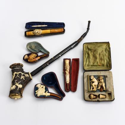 Große Jagdpfeife aus Hirschhorn mit jagdlichen Schnitzereien. Ergänzter Ebenholz-Holm mit eingelegten Messingdrähten und Perlmutt. / Erotisches Set: Frauenakt bzw. ityphallischer Handwerker, Wechselholm aus Elfenbein mit Bernstein-Mundstück, 2 Brennköpfe. / Zigarrenspitzen mit Wappen, Schwein, Eule mit Glasaugen bzw. Ornament