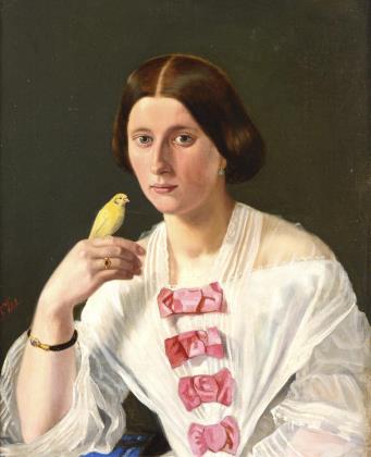 VOLCK, F.. Bildnis einer jungen Frau mit Kanarienvogel.
