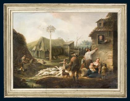 Vielfigurige Genreszene aus dem Leben der Landbevölkerung. Profilierter Waschgoldrahmen