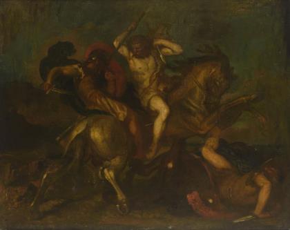 Dramatisch-wild bewegte Darstellung von Pferden und Reitern. Rückseitig auf altem Klebezettel undeutlich bezeichnet. Schwerer Profilrahmen, partiell weiß gefasst