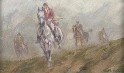 Die Reiter im Jagdkostüm im Galopp über einen Hügel