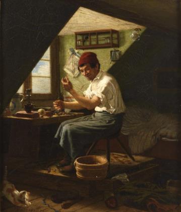 Der Schneider, mit erheitertem Gesicht zur Katze blickend, welche mit seinem Wollknäuel spielt