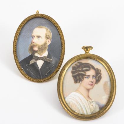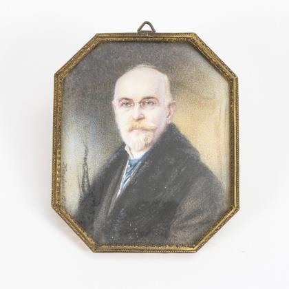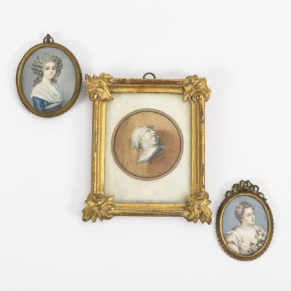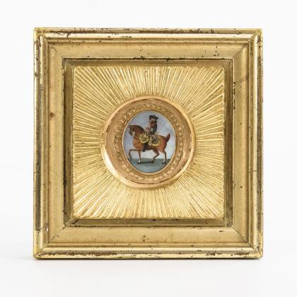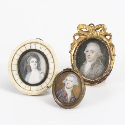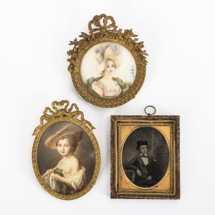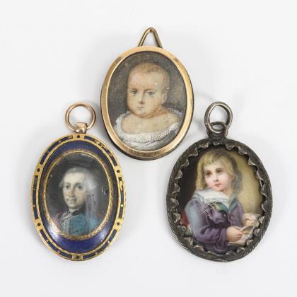 Herrenbildnis mit blauem Email an äußerer Rahmung sowie Rückseite aus blauem Glas. / Kinderbildnis. / Knabe mit Bilderbuch