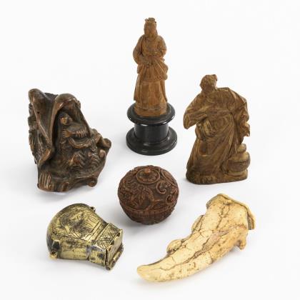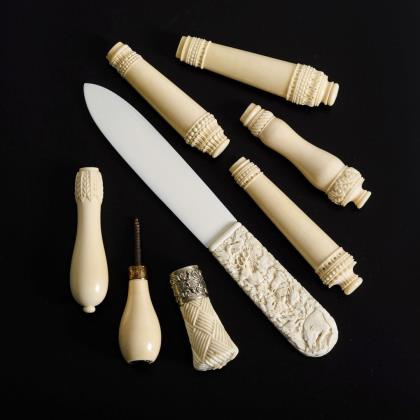Langes Zierelement mit feiner À-Jour-Schnitzranke. Fächergriff (?) mit fein geschnitzten Figurenszenen und Blumen. Snuffbottle mit geschwärzter Landschaftsgravur und asiatischem Schriftblock. Vase mit Blattranken und Elefantenfries. Seitenmarkierer mit Elefant. Floraler Kugelanhänger. Krabben-Zierelement