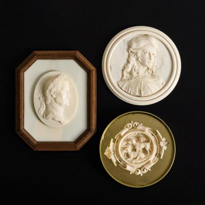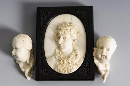 Konvolut Elfenbein: 1 Porträt im Ebenholzrahmen + 2 Puttenköpfe