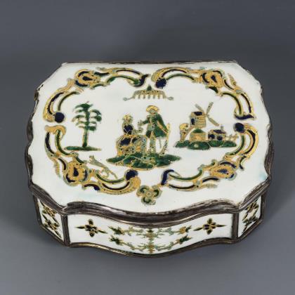 Geschweifter Korpus allseits und auf dem Boden mit Blumen verziert; auf dem Scharnierdeckel ein Paar zwischen Baum und Windmühle im Rocaillerahmen