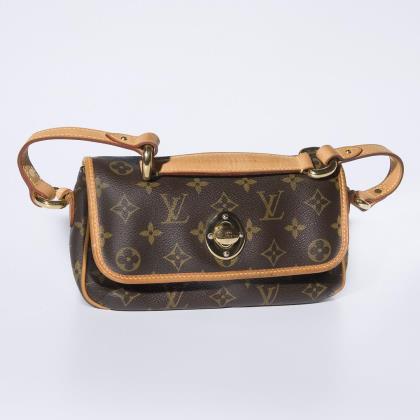 Paris, Made in France. Modell: M 40078. Classic LV-Monogramm Canvas mit Lederbesatz. Frontklappe mit Drehverschluss. Aufwendig gearbeiteter Lederhenkel mit 4 großen Ösen. Innen Textil, 1 großes Hauptfach, 1 flaches Innenfach