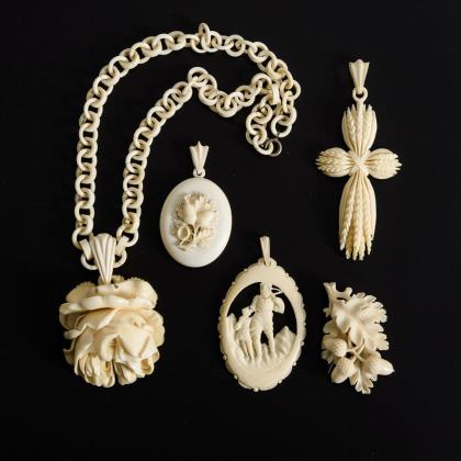 Konvolut Elfenbein: 4 Anhänger, 1 Kette und 1 Brosche