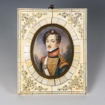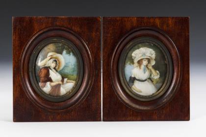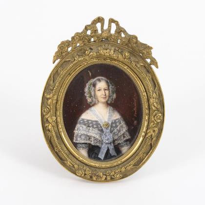 Sehr fein gemaltes Bildnis der Frau im weißen Kleid mit rotem Schultertuch. Rahmen mit Schleifenbekrönung und Aufsteller