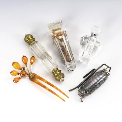 Doppelflacon mit Glasstopfen unter Scharnierdeckeln, Obeliskflacon (ursprünglich für Lippenstift) und Flacon mit Schraubverschluss. Streuer mit Schriftzeichen. Haarnadel aus Schildpatt mit facettierten Bernsteinperlen