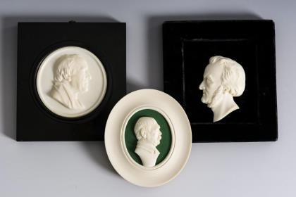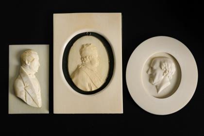 Je bezeichnete Bildnisreliefs vom römischen Kaiser Galba und von Raphael. Kartusche mit 3 Jagdhunden im Hochrelief (ursprünglich wohl eine Brosche)