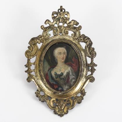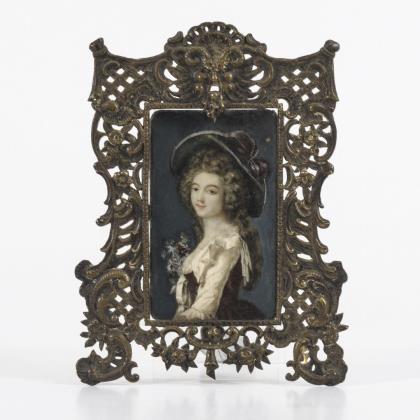 Barocke Miniatur: Höfisches Damenbildnis auf Silberplatte im Bronzerahmen
