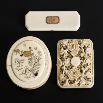 Ovale Dose mit teils reliefartigen floralen Einlagen und Appliken in Insektenform. / Scharnierdeckel und Boden der Quaderdose mit Rosenzweigen über mosaikartig durchbrochenem Hintergrund (Zigarettenetui aus Dieppe?). / Längliche Dose mit Riffelung und Rotgoldkartusche: Monogramm "ED"