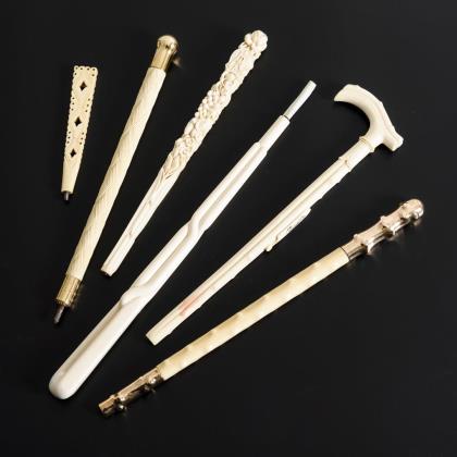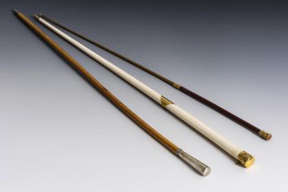 Dirigentenstab aus einem Stück Elfenbein mit graviertem Knauf sowie Manschette und Zwinge aus Gold. Auf der Goldmanschette Widmung an Alfred Cellier vom St. James Theatre London mit Datum 1867. / Flanierstab mit graviertem "L" unter einer Krone am Silberknauf. / Gerte mit reliefierter Messingmontierung und Karneol