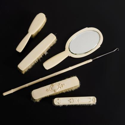 Handspiegel mit facettiertem Glas. Zusammengehörende Haarbürste und Kleiderbürste. 2 Kleiderbürsten mit leeren Kartuschen. 1 Anziehhaken in Form eines Knotenstockes