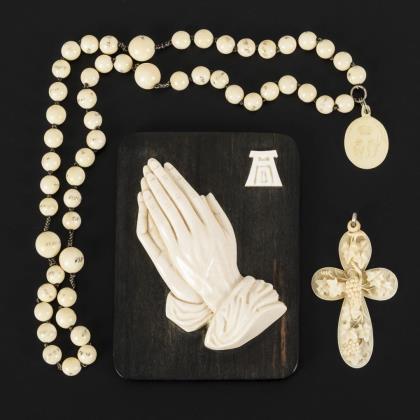 3x Elfenbein: Schnitzrelief, Rosenkranz und Kreuzanhänger