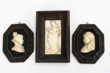 3 Elfenbein-Reliefs: Heilige Barbara und 2 Porträts.