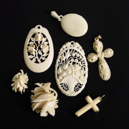 Konvolut Elfenbein: 5 Anhänger und 2 Broschen