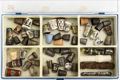 51 Fingerhüte, 3 Nadel- und 1 Garnbehälter.