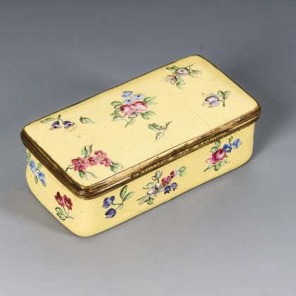 Tabatiere mit gelbem Fond; innen weiß. Allseits, auf dem Deckel und dem Boden sowie im Deckel mit bunten Streublumen bemalt