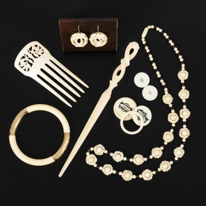 Floral reliefierte Goldmontierung am Armreif. Fein geschnitzte Ohrhänger mit Ährenkranz und Schleifenbekrönung. Hutnadel und Steckkamm. Offene Schraubdose (counter box) mit 4 Spielmarken (Jetons); diese mit Buchstaben bemalt. Dazu 2 kleine Spielmarken mit Ziffern 5 bzw. 10. Bein-Kette mit Perlen und Blüten