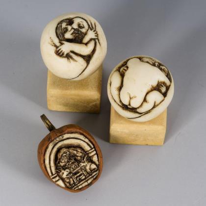 Bacchanal vor antiken Ruinen. Miniaturteller mit Bildnis ""Elysabet" sowie feinen Ranken. Ballbüchlein (Carnet de Bal) mit 6 Elfenbein-Blättern. Bronze-Protom einer Göttin (wohl Venus). Wendehaupt mit Christuskopf und Totenschädel sowie Stein-Totenkopf je mit vertikaler Bohrung