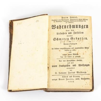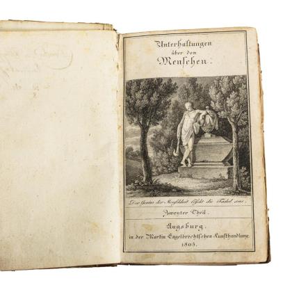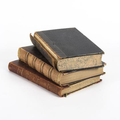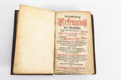 "Becher's kluger Haus-Vaters erster Teil, Leipzig 1778. 1142, (112 Register) Seiten, in Halbleder jünger nachgebunden, Titelblatt fehlt. / "Karl Yocke's Reise-Taschenbuch für junge Handwerker und Künstler - ein allgemeiner Wegweiser durch ganz Deutschland und die angrenzenden Länder ...", Eisleben 1872, 270 Seiten, Karten fehlen, Halbledereinband. / "Der berüchtigten Englischen Gräfin Maria von Pembrock seltene Geheimnüsse bestehend in einer Melodischen Schreib Gedächtnüß Mahler und Punctirkunst ....woraus ... Schicksal zu erforschen", Ulm und Memmingen 1752, 135 Seiten, Pappeinband. / Douy: "Lecons d'un frère a sa soeur sur l'histoire naturelle, ..." Paris1836, 216 Seiten und 14 ganzseitige Tierillustrationen, im goldgeprägten Ledereinband. / J.P. Uz: "Lyrische und andere Gedichte", Leipzig 1765, vierte Auflage, 248 Seiten, im Pappeinband